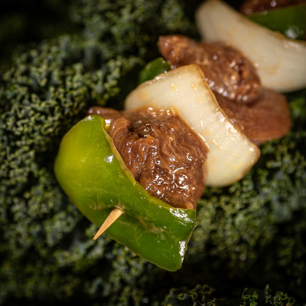 Brochette faite de 4 cubes de poitrine de poulet dans une marinade maison sucré à base de Sauce soya et d’ail. Emballé sous-vide, frais.
