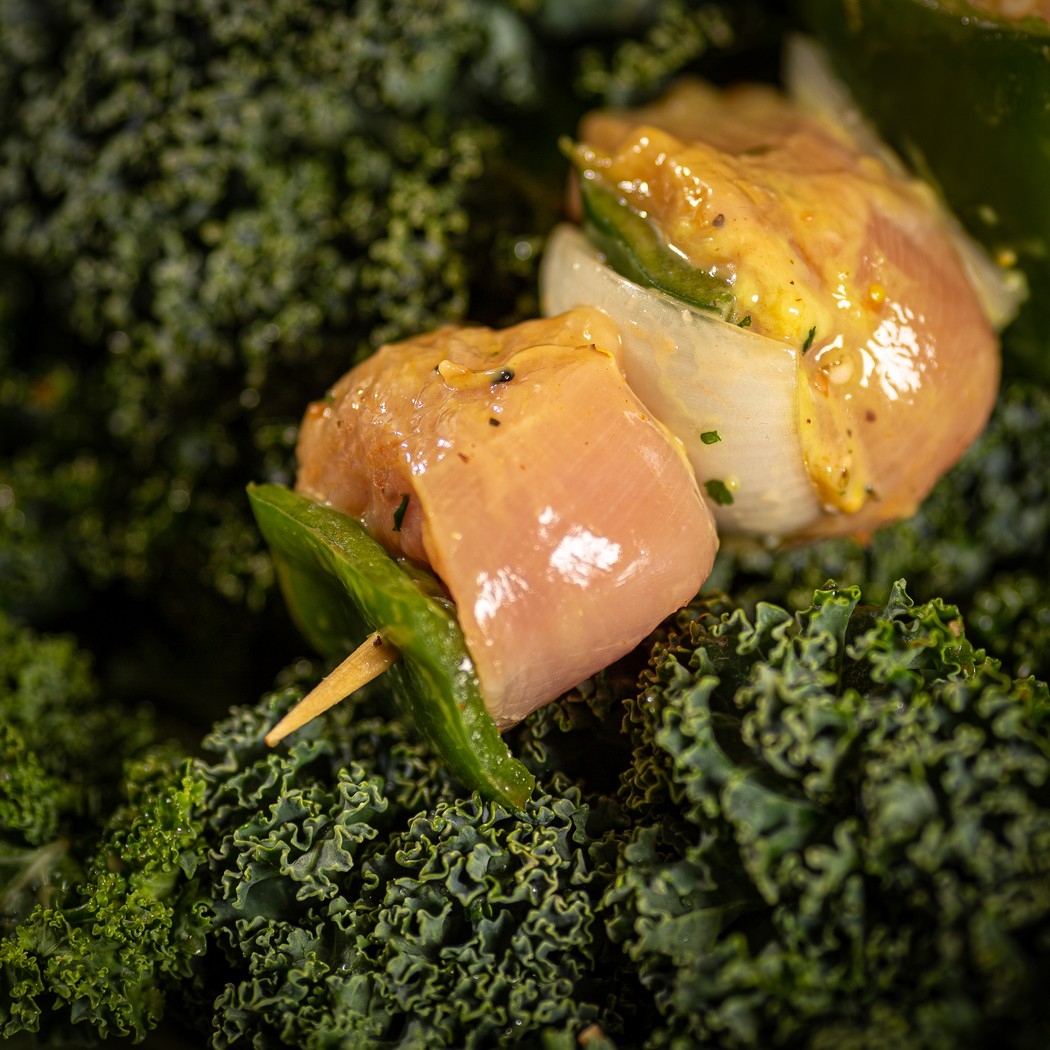 Brochette faite de 4 cubes de poitrine de poulet marinés Miel et Moutarde. Emballé sous-vide, frais.