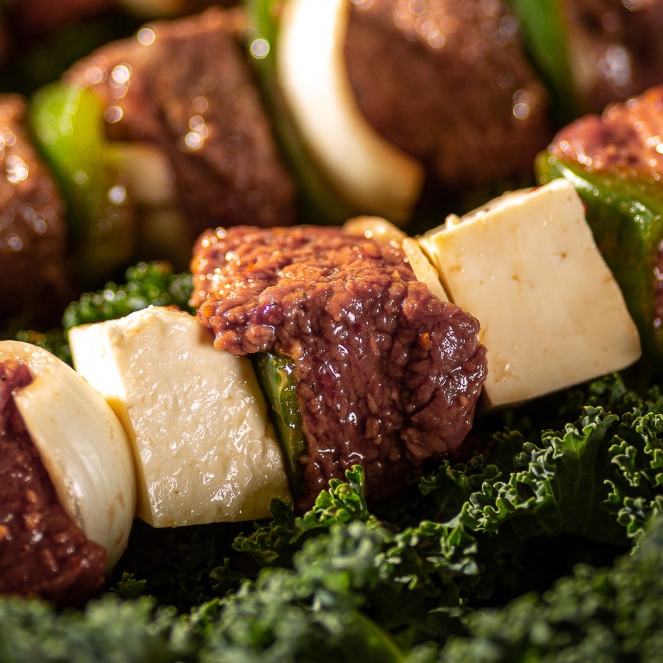Brochette faite de 3 cubes d’intérieur de ronde de bœuf attendri (Marinade maison Sucrée Piquante) et de 2 morceaux de fromage à griller le Démon de la Fromagerie des Basques. Emballé sous-vide, frais.