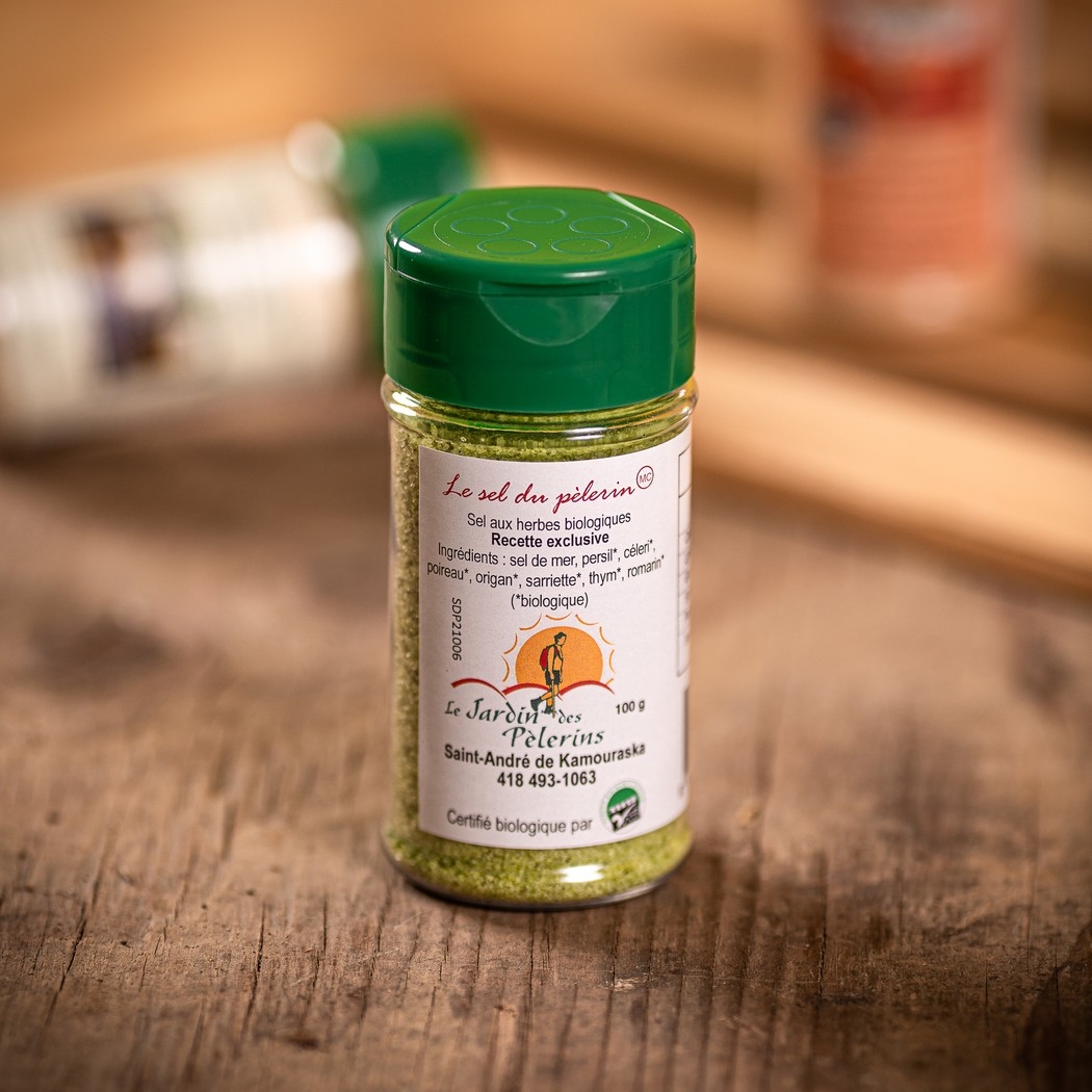 Sel aux herbes biologiques, produit par le Jardin des Pélerins du Kamouraska. 100 g