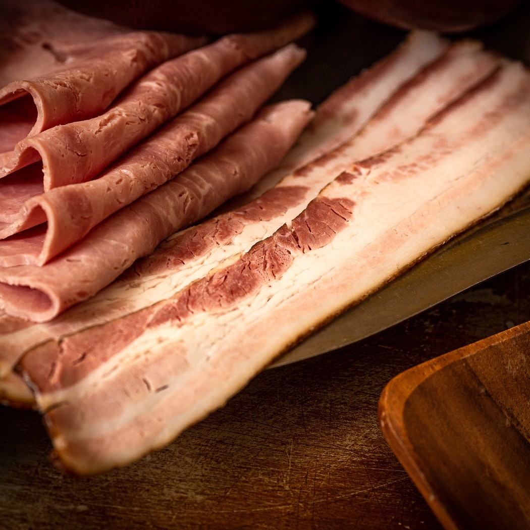 Notre populaire Bacon fumé maison, au bois d’érable. Emballé sous-vide, frais.